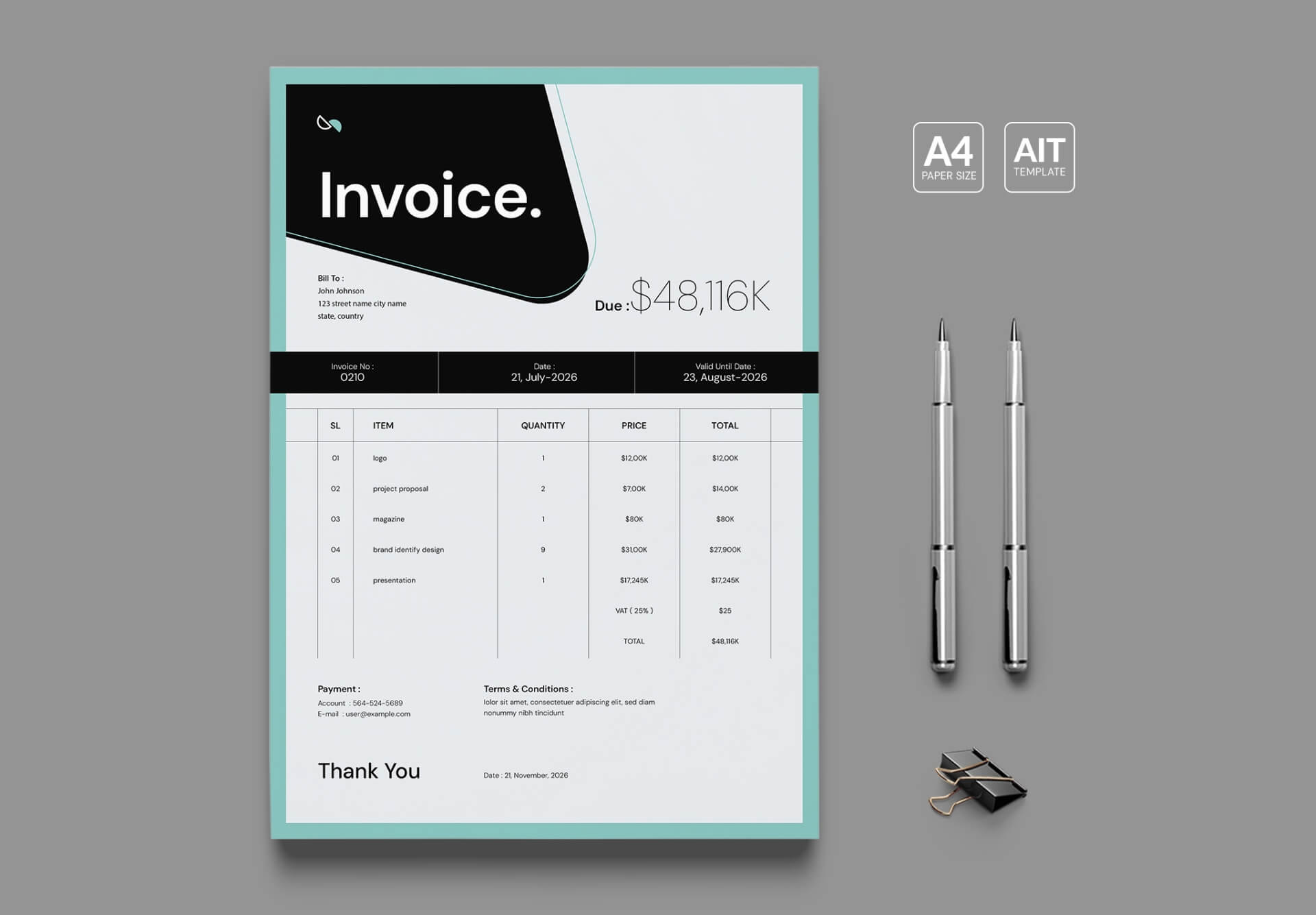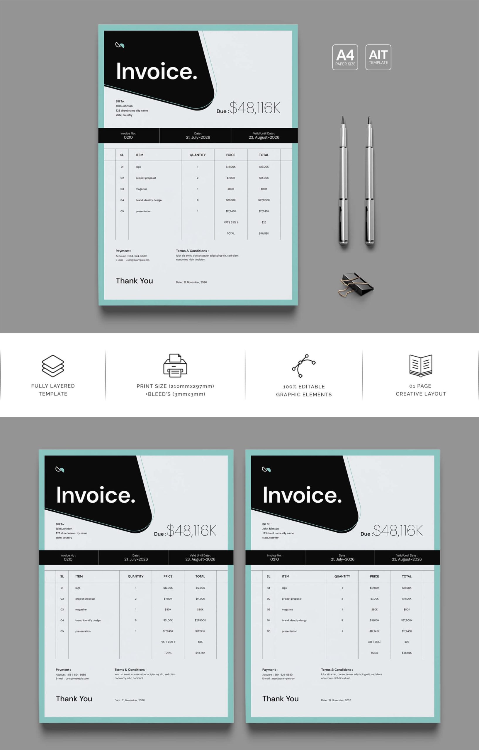 Creative Invoice Template is editable text, logo, color & re sizable vector elements. Based designed in Adobe Illustrator CC 2023. Ready to print professional template with free fonts.