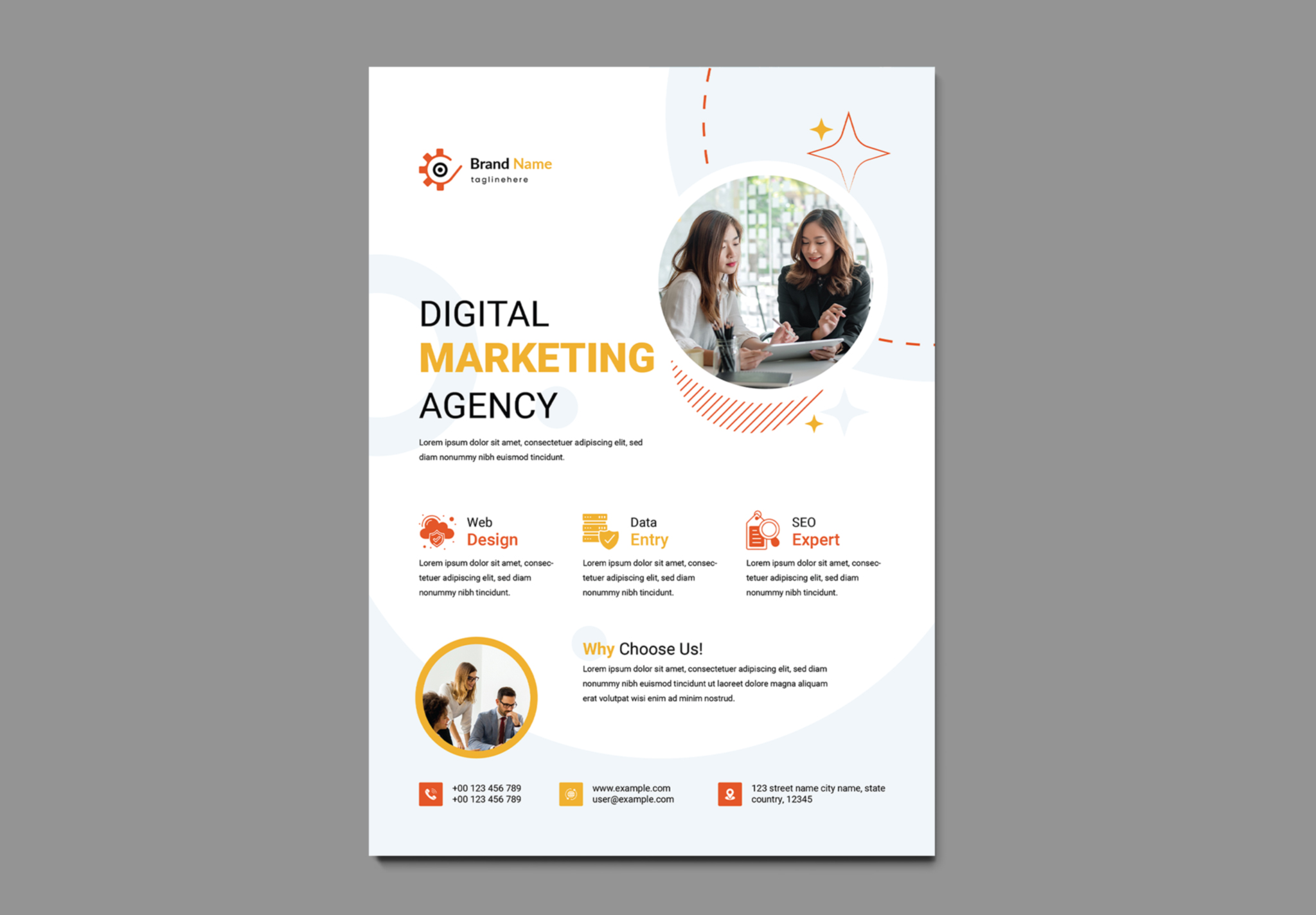 A digital marketing flyer description includes an attention-grabbing headline, highlighting customer benefits, and a clear call to action (CTA) flyer template with easy-to-find contact information.