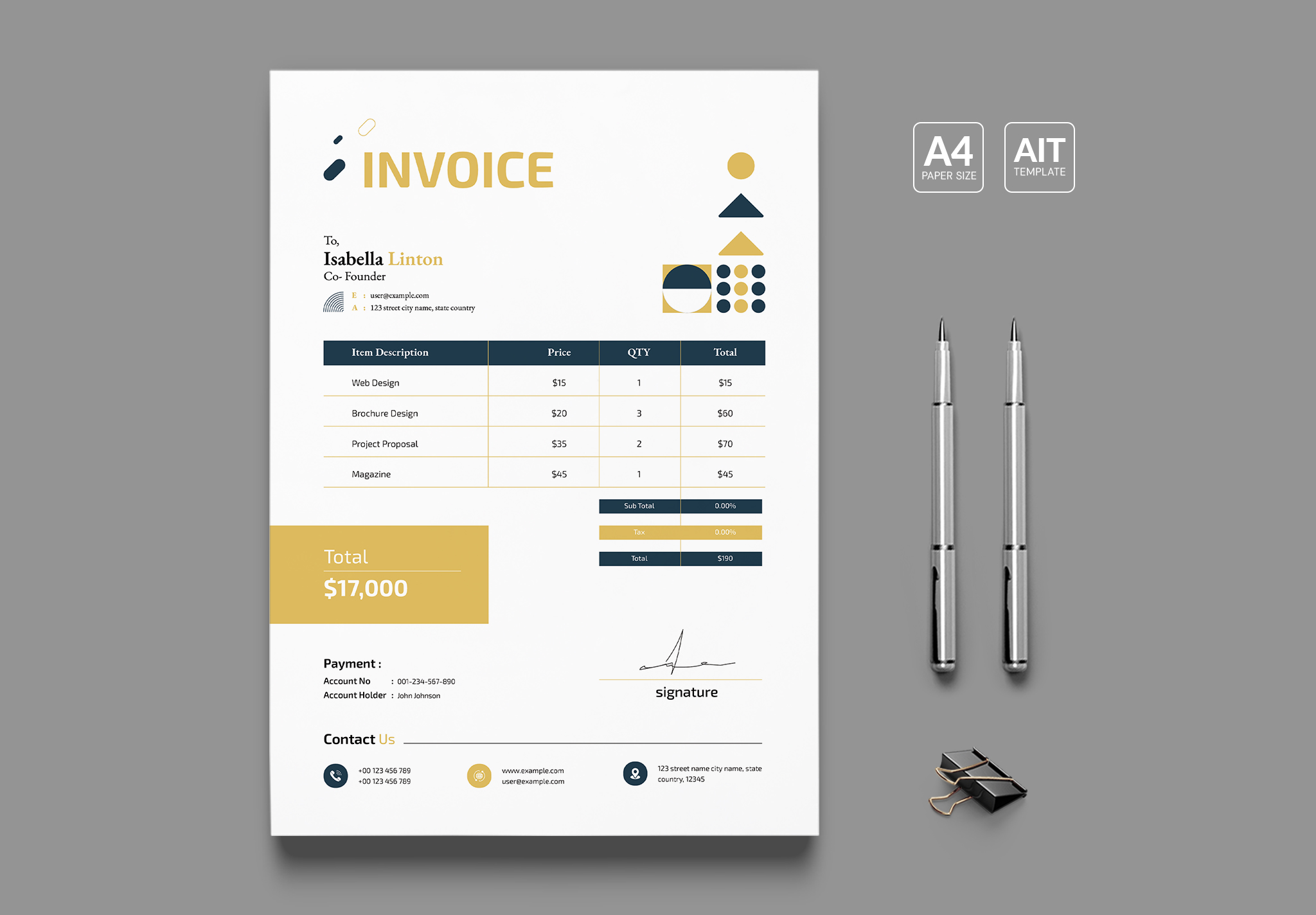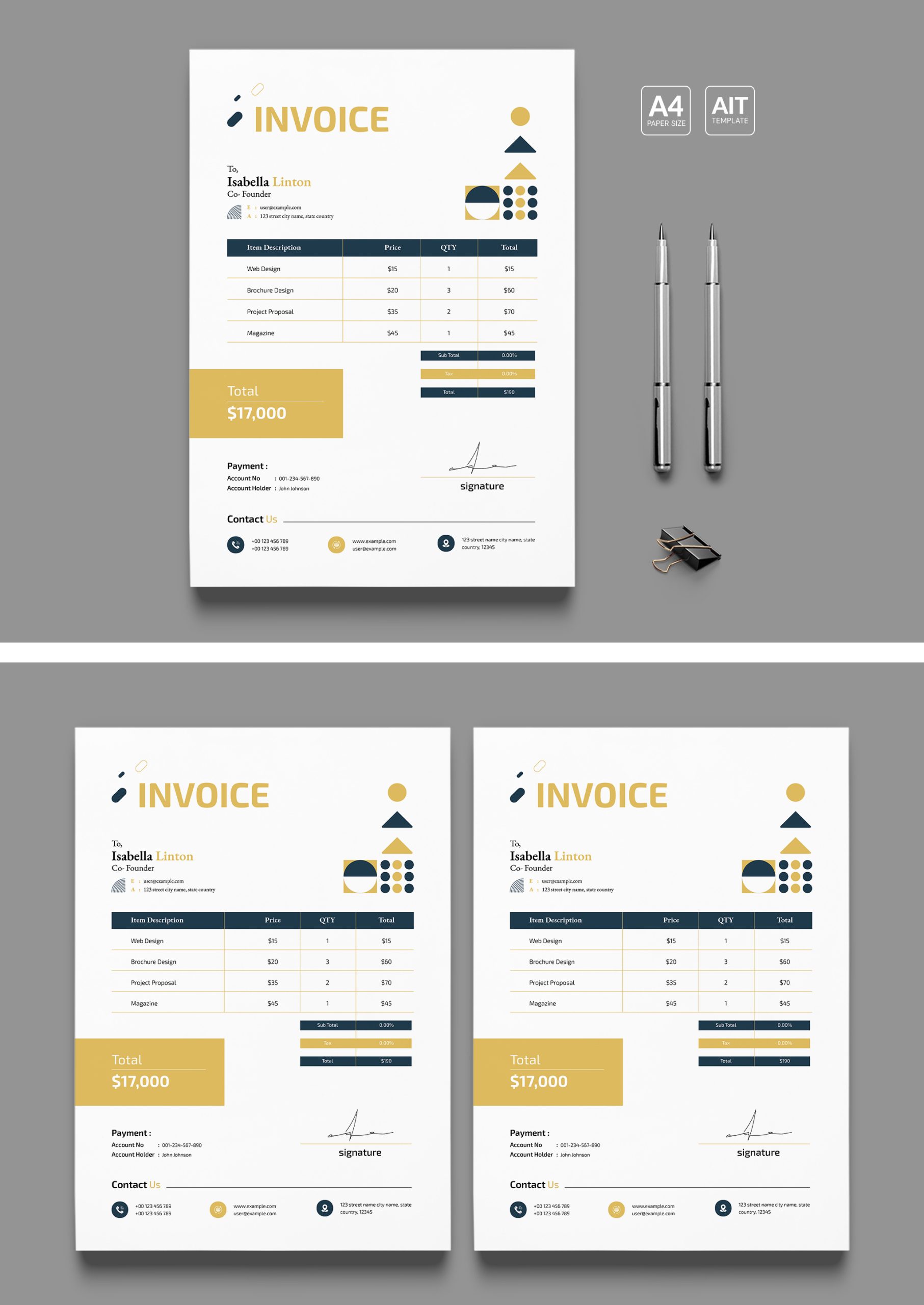Invoice template is editable text, logo, color & re sizable vector elements. Based designed in Adobe Illustrator CC 2022. Ready to print professional template with free fonts.
