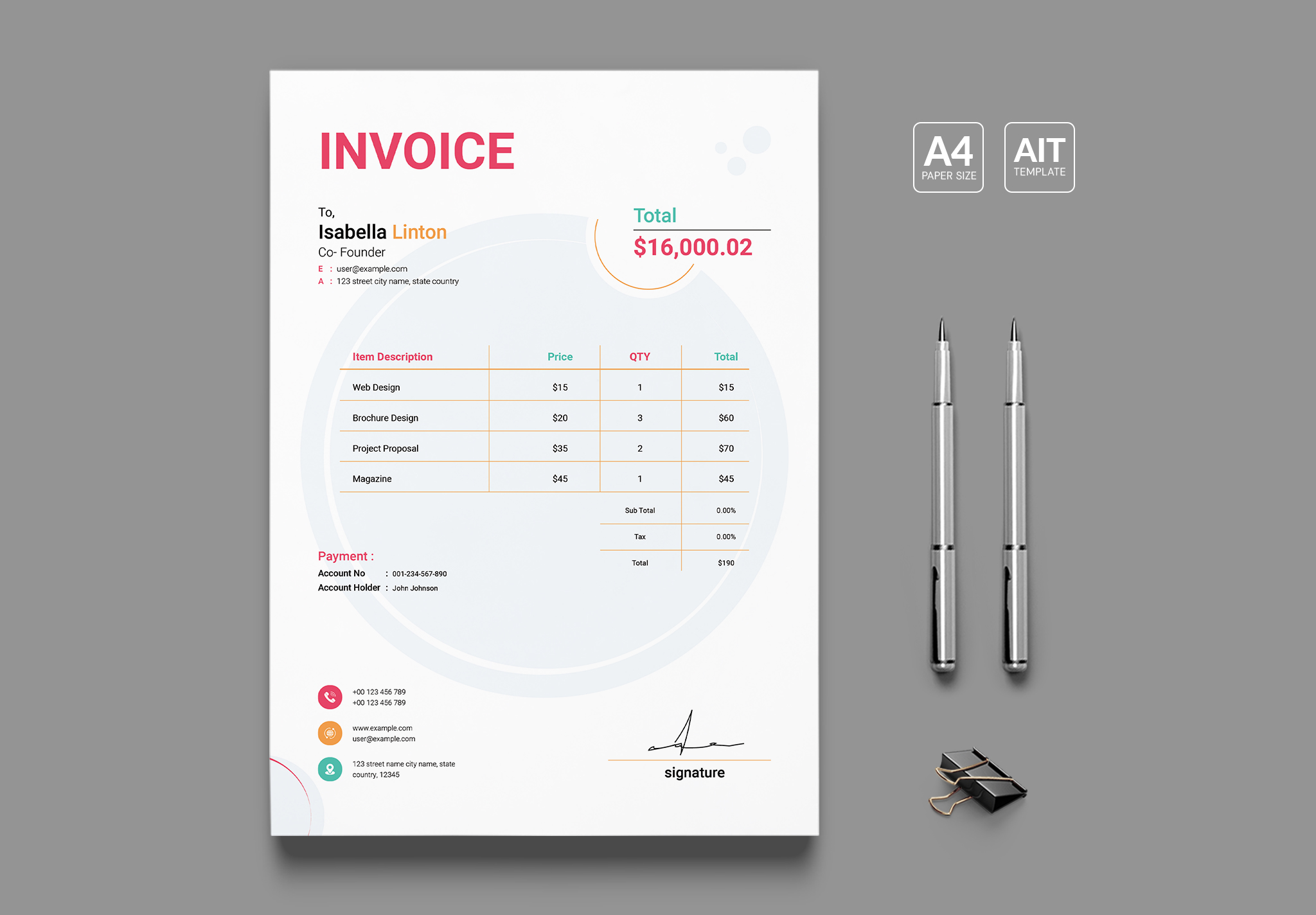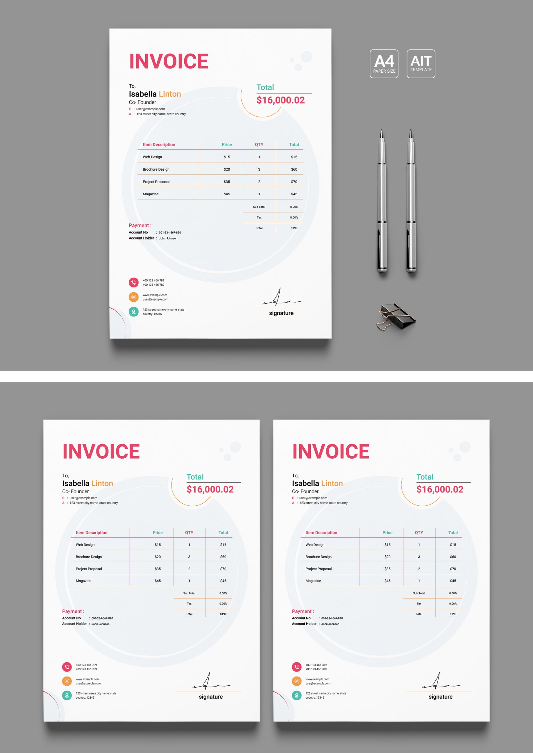 Invoice Template is editable text, logo, color & re sizable vector elements. Based designed in Adobe Illustrator CC 2022. Ready to print professional template with free fonts.