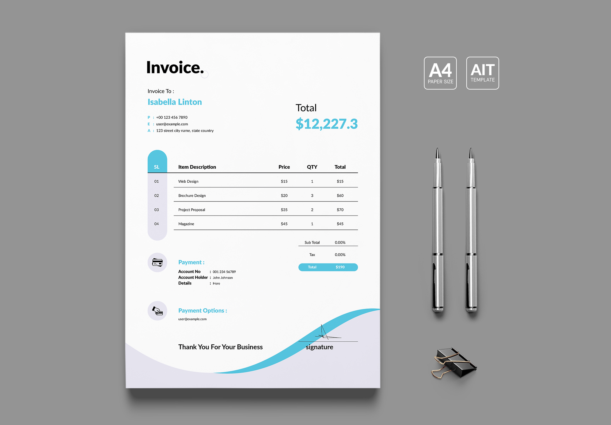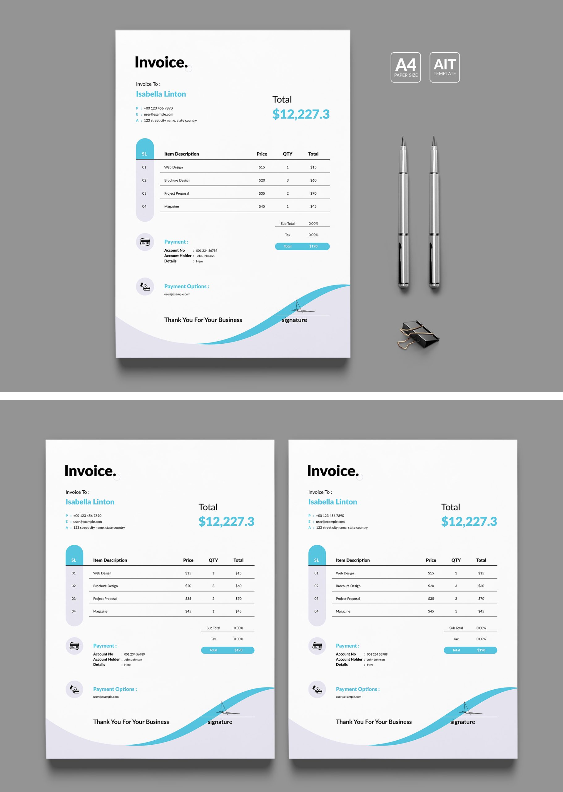 Invoice Template is editable text, logo, color & re sizable vector elements. Based designed in Adobe Illustrator CC 2022. Ready to print professional template with free fonts.